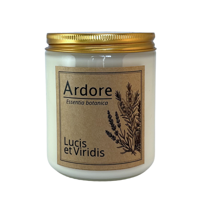 Duża, rzemieślnicza świeca sojowa ARDORE„Lucis et Viridis z linii Essentia Botanica o wadze 200 g, umieszczona w grubym, transparentnym szkle ze złotą pokrywką. Bazuje na europejskim, niemodyfikowanym wosku sojowym i autorskiej kompozycji olejków eterycznych: rozmarynowym, sosnowym, herbacianym, cytrynowym oraz lawendowym. Gramatura 200 g jest zoptymalizowana do aromatyzowania większych pokoi, salonów oraz otwartych przestrzeni dziennych. Długi czas spalania i ciche skwierczenie drewnianego knota wzbogacają domowe otoczenie.
